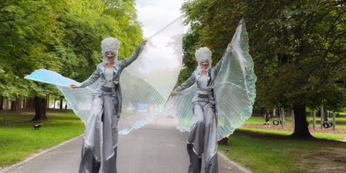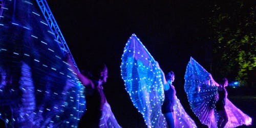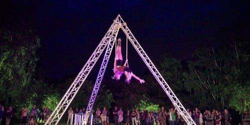 While we strolled through the garden as Grandes Dames under the bright sunshine, a storm arrived early in the evening. Nevertheless, most visitors braved the rain, and afterwards, we were able to continue the program with our duo trapeze act and LED show.