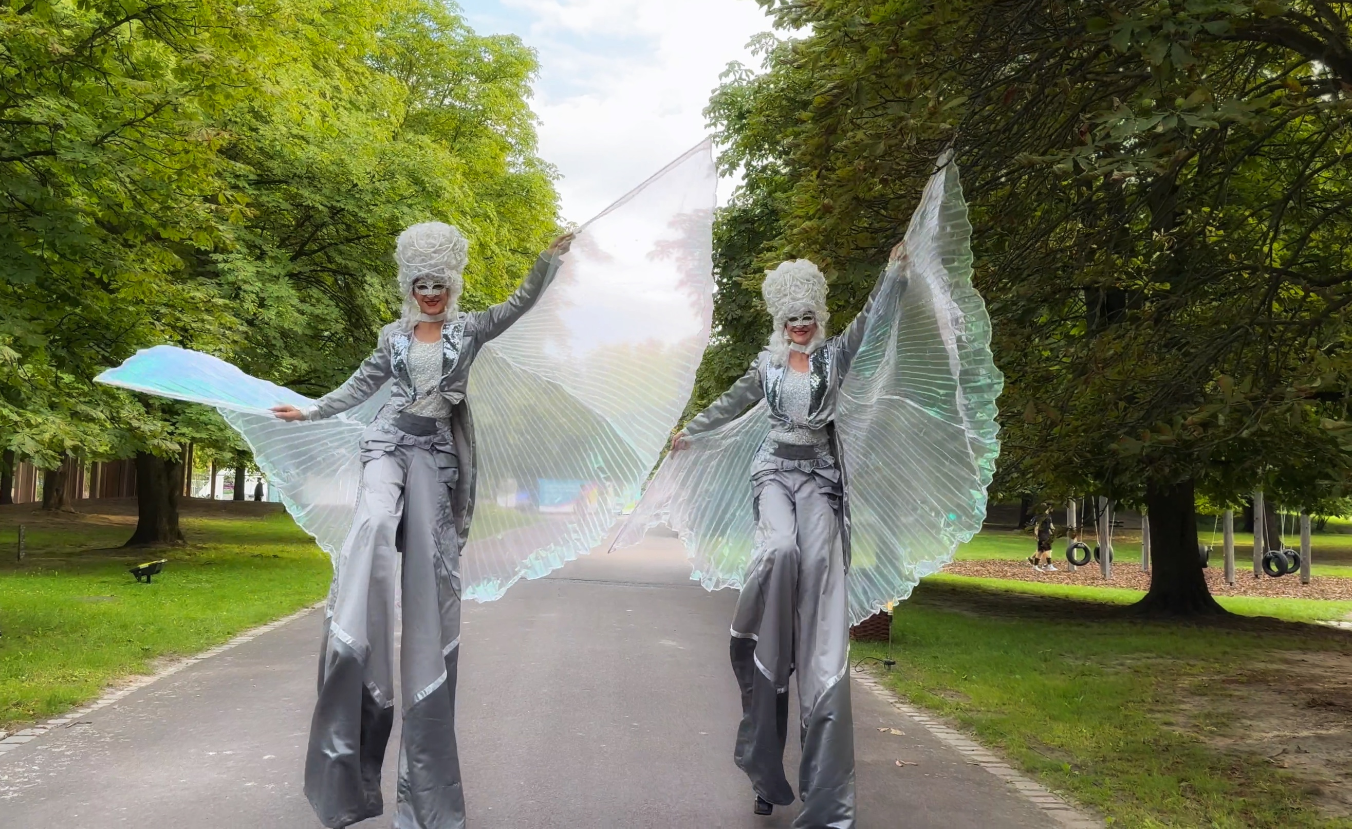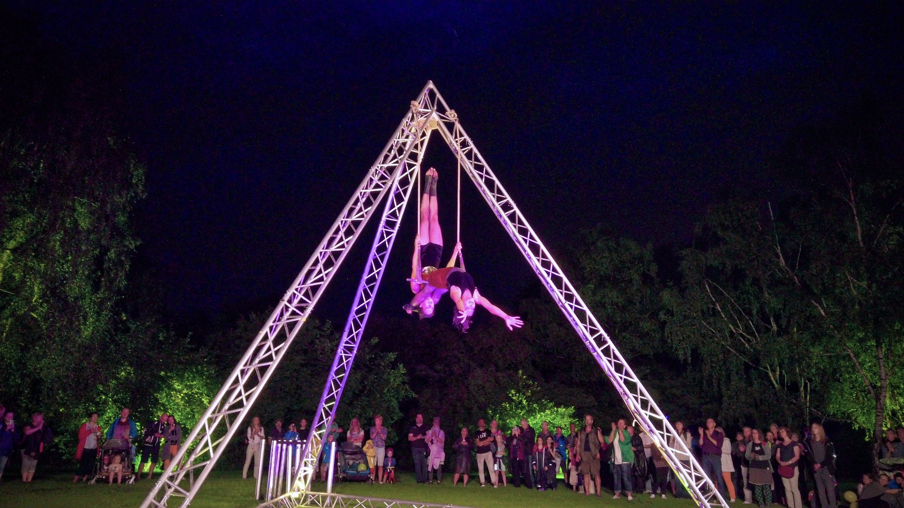 While we strolled through the garden as Grandes Dames under the bright sunshine, a storm arrived early in the evening. Nevertheless, most visitors braved the rain, and afterwards, we were able to continue the program with our duo trapeze act and LED show.