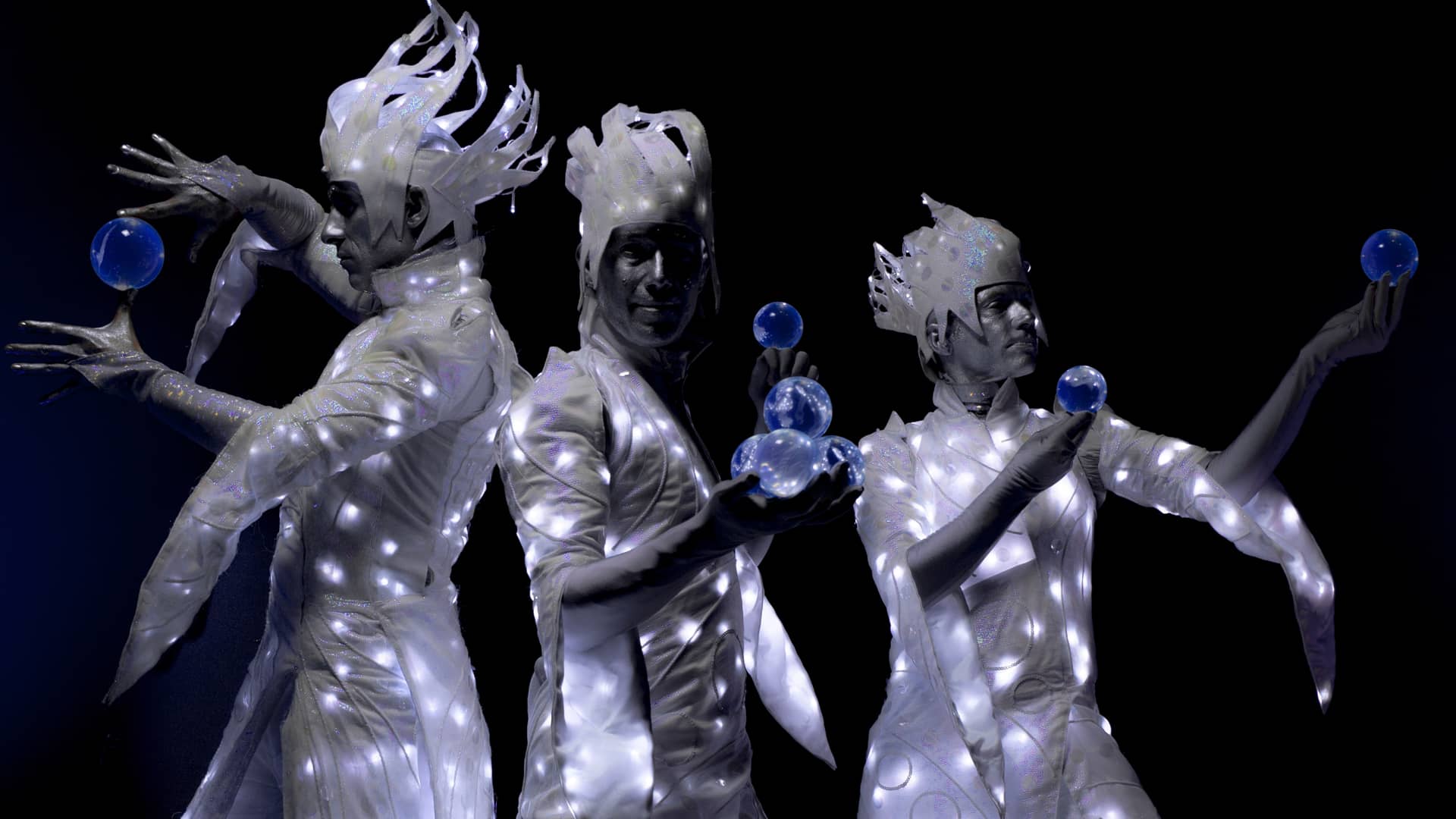 The peaceful and graceful creatures move with a Zen-like presence. Glass balls are balanced miraculously and glide over their bodies as if by magic. This spectacle is accompanied by a subtle soundscape to whisk the viewer into a fantastic dream.