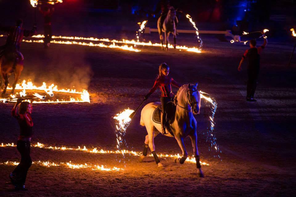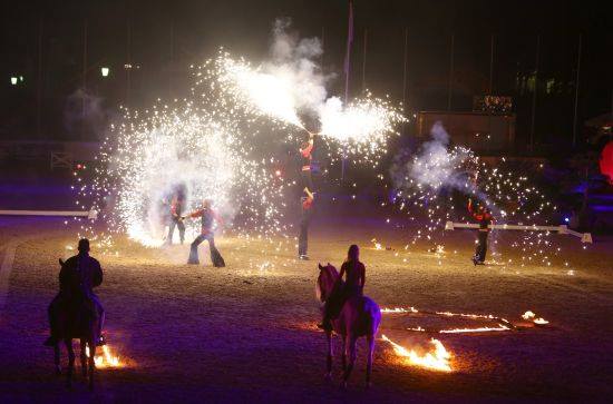 Zum großen 100. Nationenpreis des Springreitens haben wir in Zusammenarbeit mit Excalibur Horse Shows eine Feuershow mit Pferden entwickelt, die wir auf dem Galaabend in Mannheim vorführten.