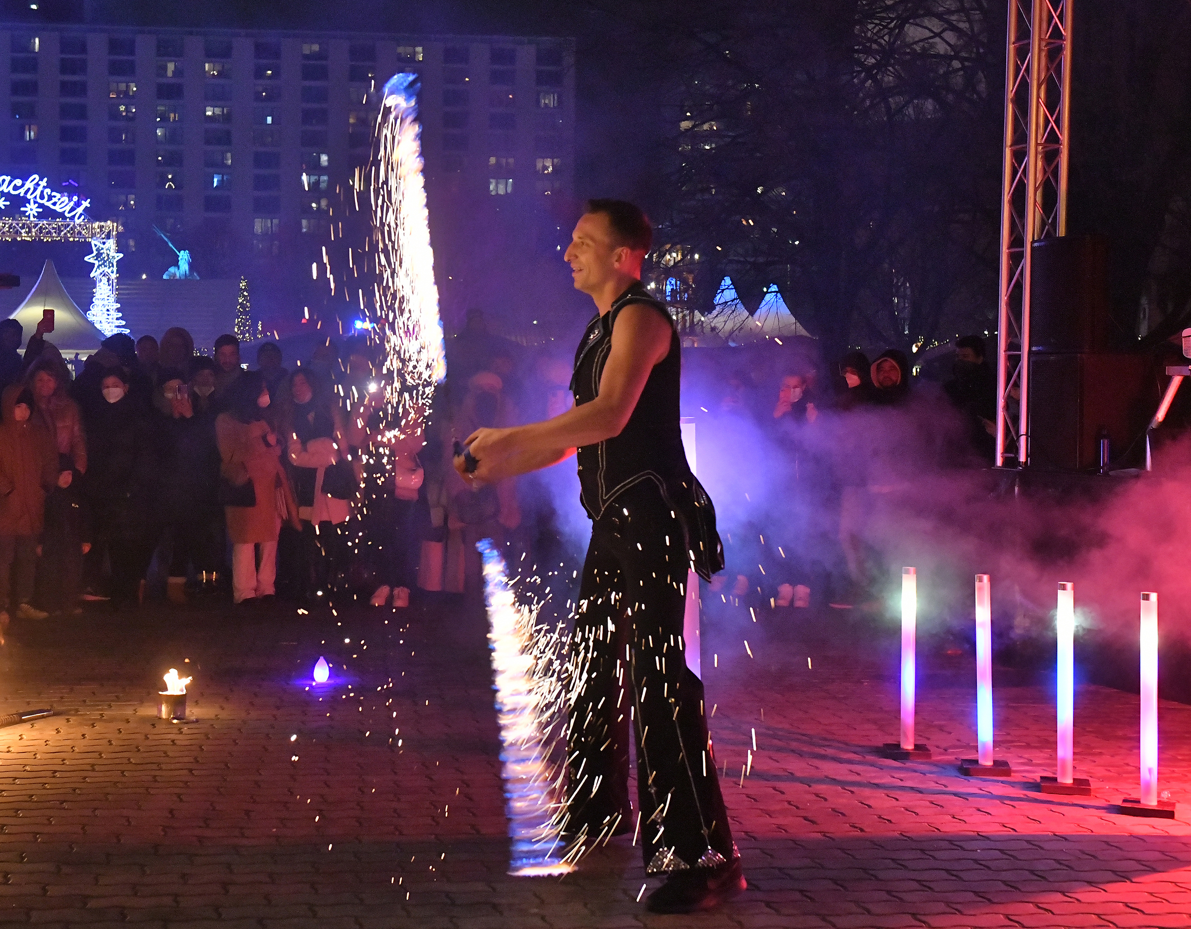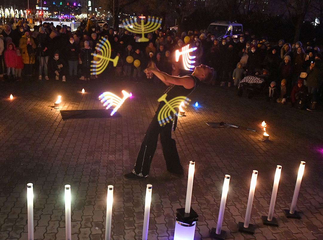 Ende des Jahres wird traditionell das jüdische Lichtfest Chanukka gefeiert. Zu diesem Anlass spielte François eine Feuer- und Lichtshow auf dem Alexanderplatz.